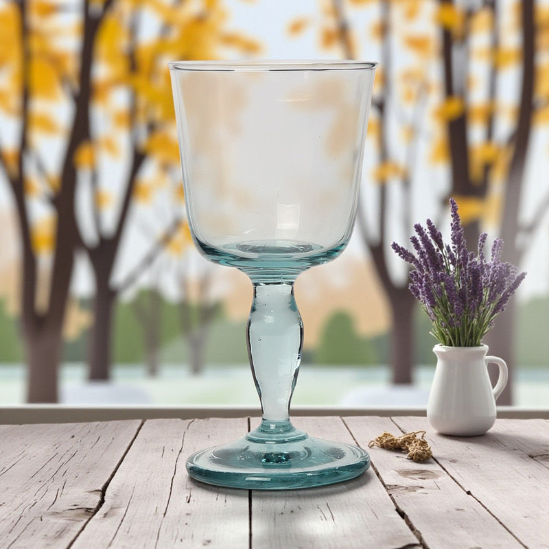 A clear recycled glass wine glass with a fluted shape and a thick stem.