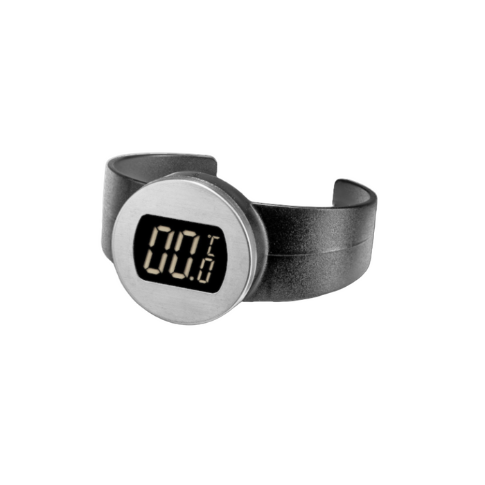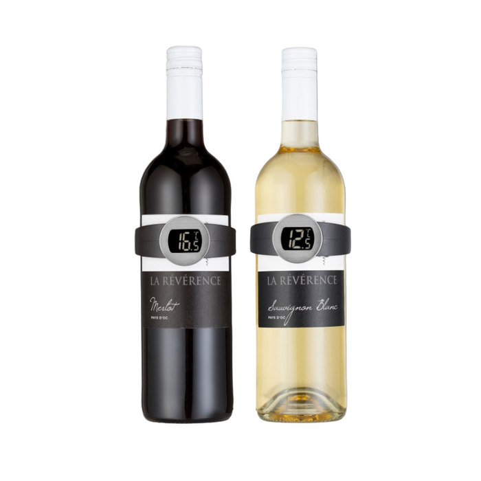 A red wine bottle warming sleeve with a silver clicker, designed to bring red wine to the perfect temperature.