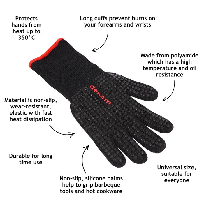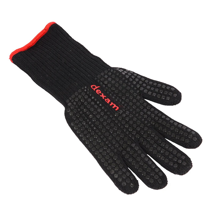 A black heat resistant grilling glove with red accents and non-slip silicone palms, featuring long cuffs.