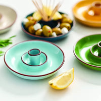 Made from traditional terracotta and hand-finished with a vibrant glaze, this beautiful dish features multiple compartments — ideal for serving olives alongside stones or a selection of small appetisers.