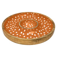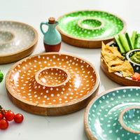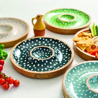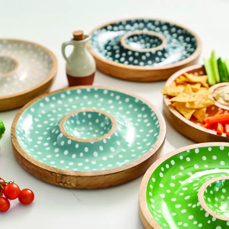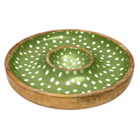 Crafted from sustainable mango wood and hand-finished with a playful spotted design, this serving bowl offers a central dip section surrounded by ample space for chips, crudités, breads, or fruit.