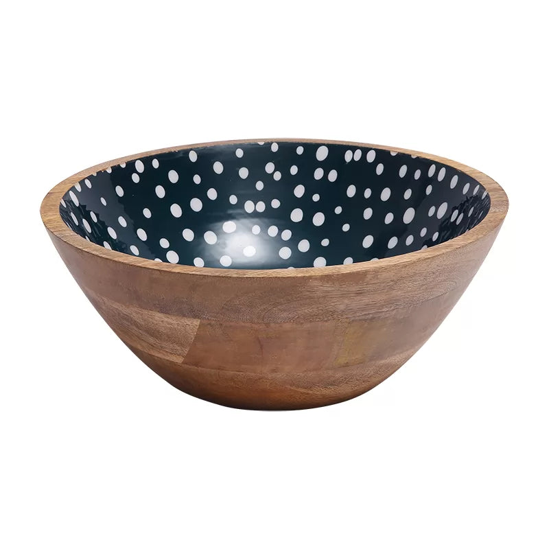 Made from sustainably sourced mango wood and hand-finished with a distinctive olive green spotted design, this stylish bowl is perfect for serving fresh salads, fruits, and sides.